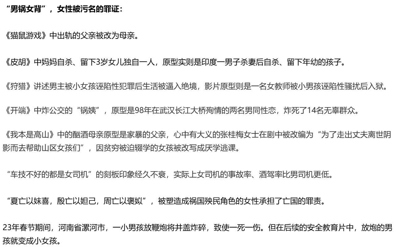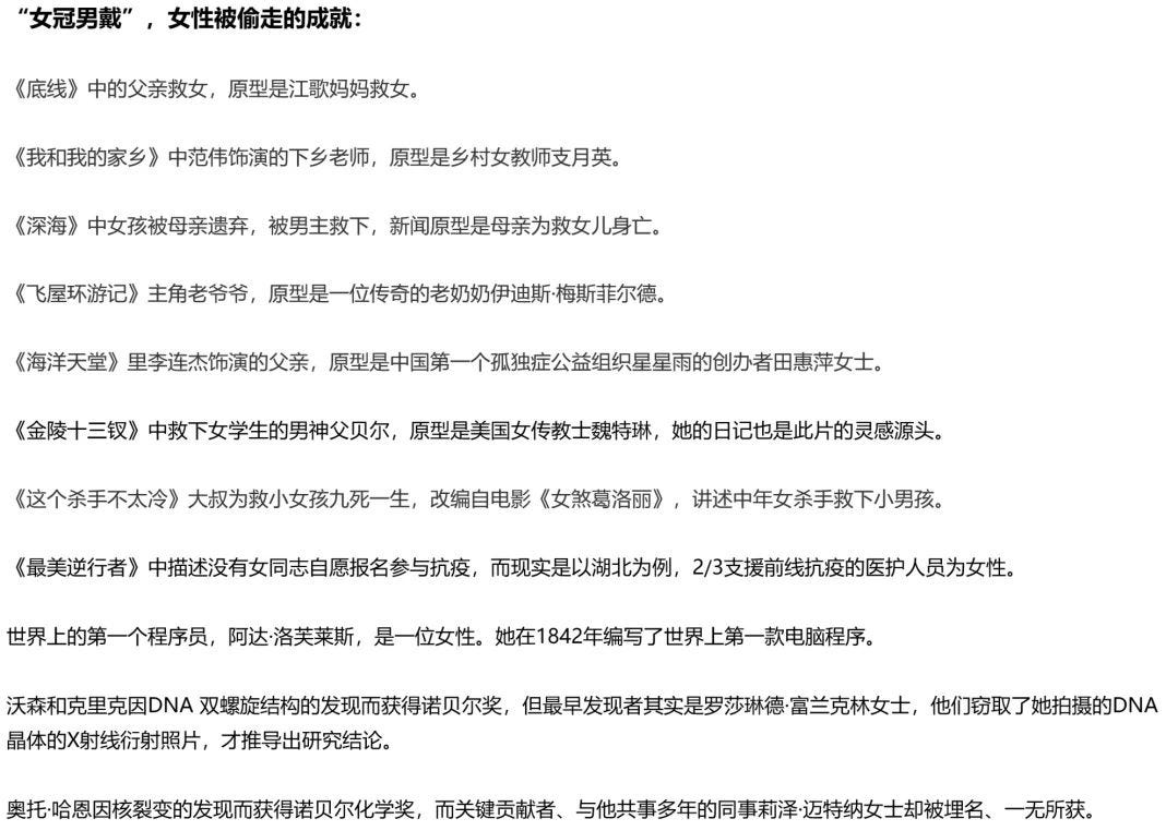 忽视女性本就受歧视、受不平等处境的现实,进一步贬低女性、隐藏女性成就。